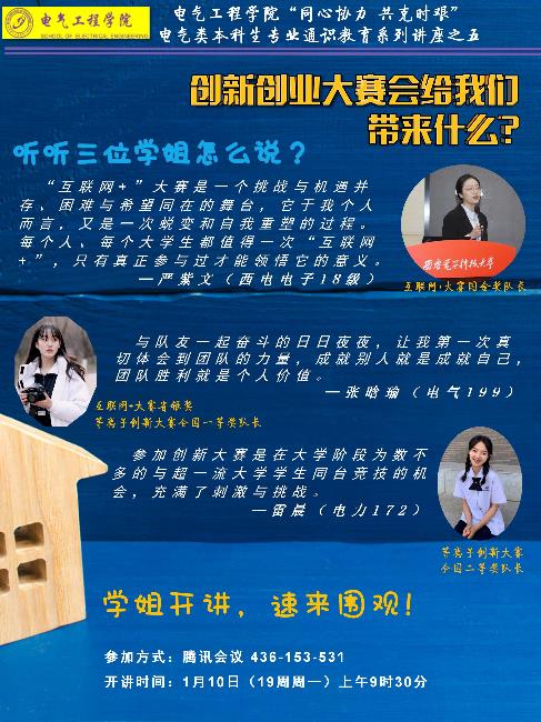 为推进学院本科生的双创教育,做好2022年第八届中国国际“互联网+”大学生创新创业大赛备赛工作,1月10日上午9点半,电气工程学院举办了电气类本科生创新创业大赛线上专题讲座。学院邀请了三位优秀双创学生团队负责人,围绕“创新创业大赛会给我们带来什么?”这一主题,进行线上项目报告和经验分享。本次线上专题讲座由杨国清老师主持,电气工程学院2020、2021级共556名本科生观看了专题讲座。