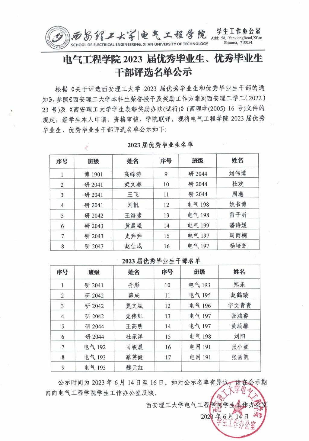 电气工程学院2023届优秀毕业生、优秀毕业生干部评选名单公示